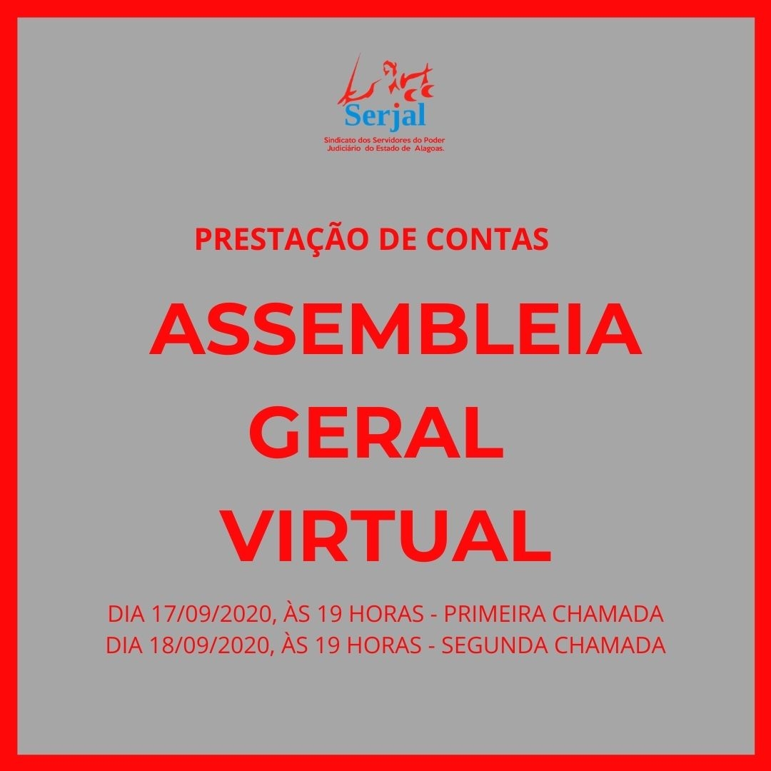 Cumprindo os princípios de transparência e as normas estatutárias, o SERJAL realiza esta semana a Assembleia Geral Ordinária de Prestação de Contas relativa ao 1º semestre de 2020. Conforme a convocação feita por meio de Edital publicado no dia 28 de agosto, a Assembleia será realizada em ambiente virtual, na plataforma ZOOM, no dia 17 de setembro (quinta-feira), às 19h, em primeira chamada e, caso não haja quórum suficiente, no dia 18 de setembro (sexta-feira), às 19h, em segunda chamada, com qualquer número de filiados presentes.