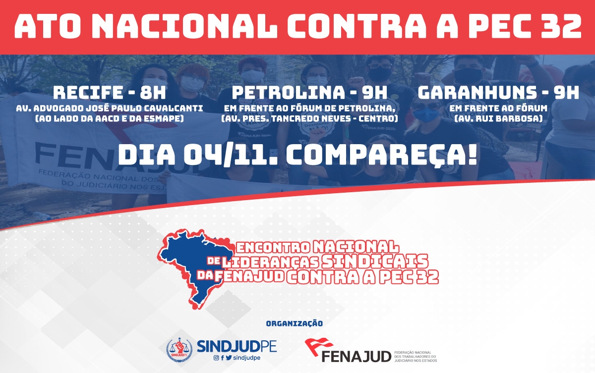 Dia 04 de novembro a FENAJUD e o SINDJUD/PE realizarão um grande ato contra a PEC 32/2020. O ato ocorrerá a partir das 8 da manhã, na Av. Advogado José Paulo Cavalcanti, ao lado da AACD e ESMAPE, na rua da entrada Sul do Fórum Rodolfo Aureliano e compõe a programação do Encontro de Lideranças Sindicais da FENAJUD contra a PEC 32, essa PEC nefasta que, se aprovada, só vai destruir e precarizar o serviço publico.