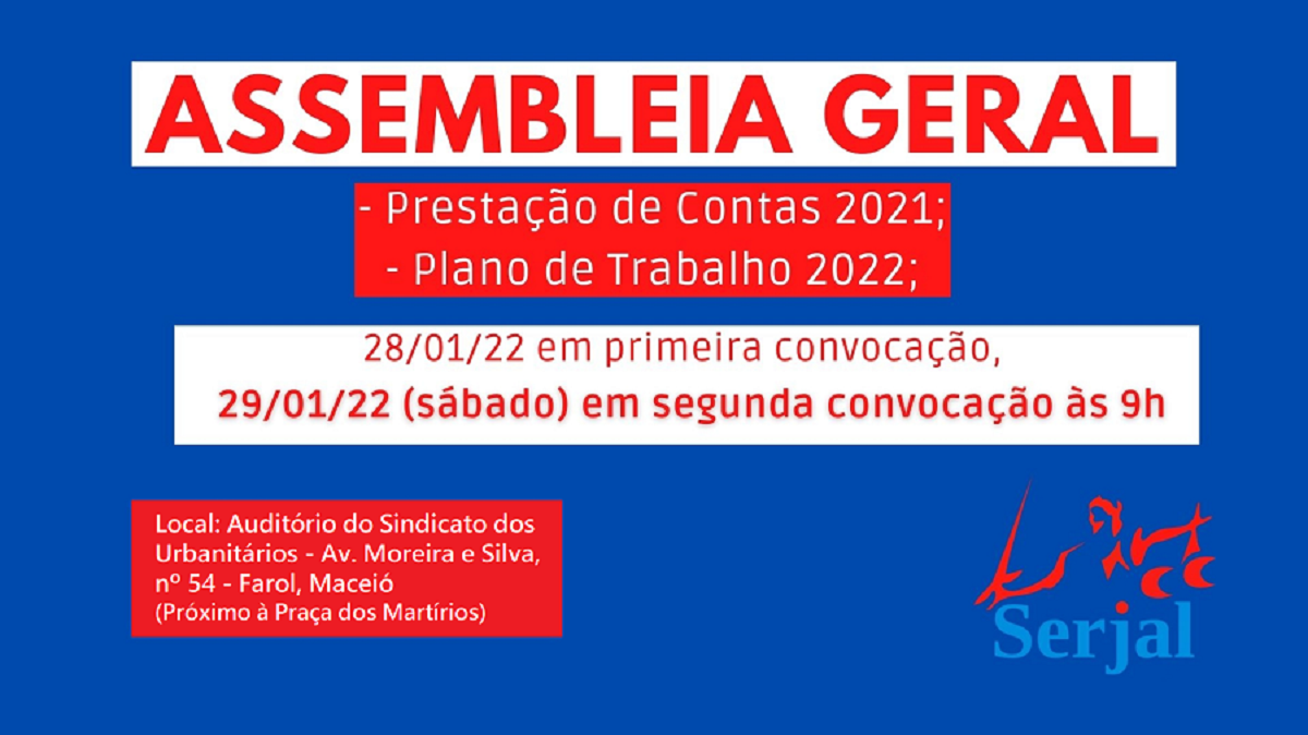 Janeiro é mês de planejamento e prestação de contas das ações e movimentações financeiras do SERJAL. Sempre atenta às RESPONSABILIDADES estatutárias e fiel ao compromisso com a TRANSPARÊNCIA a Diretoria está convocando todos os filiados e filiadas para se reunirem em ASSEMBLEIA GERAL, no dia 28 deste mês, às 09h, em primeira convocação e, caso não haja quórum, no dia 29 de janeiro, às 09h, em segunda convocação, no auditório do Sindicato dos Urbanitários, localizado na Av. Moreira e Silva, nº 54, próximo à Praça dos Martírios, em Maceió.